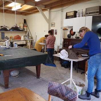Werken met klei, zacht en egaal of met kleine zandkorrels. De klei past zich gemakkelijk aan; er zijn ook mallen aanwezig om de klei in te vormen. De workshop neemt ca. 3 uur in beslag en alle deelnemers hebben dan een eigen werk gemaakt. Deze beelden/schalen moeten ca. 3 weken drogen en kunnen dan gebakken worden. Vervolgens vragen we de deelnemers nog 1 x terug te komen tijdens de openingstijden van het Open Atelier om te glazuren. Dan worden de beelden/schalen nogmaals gebakken en is het eindresultaat klaar.